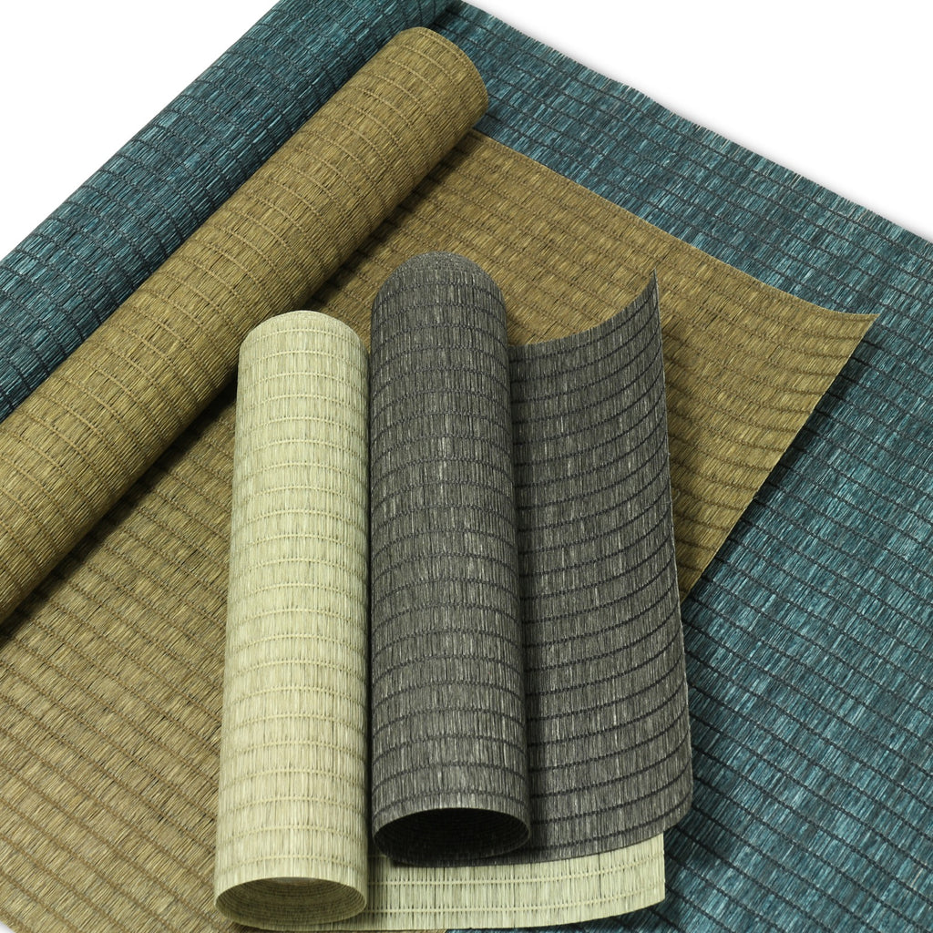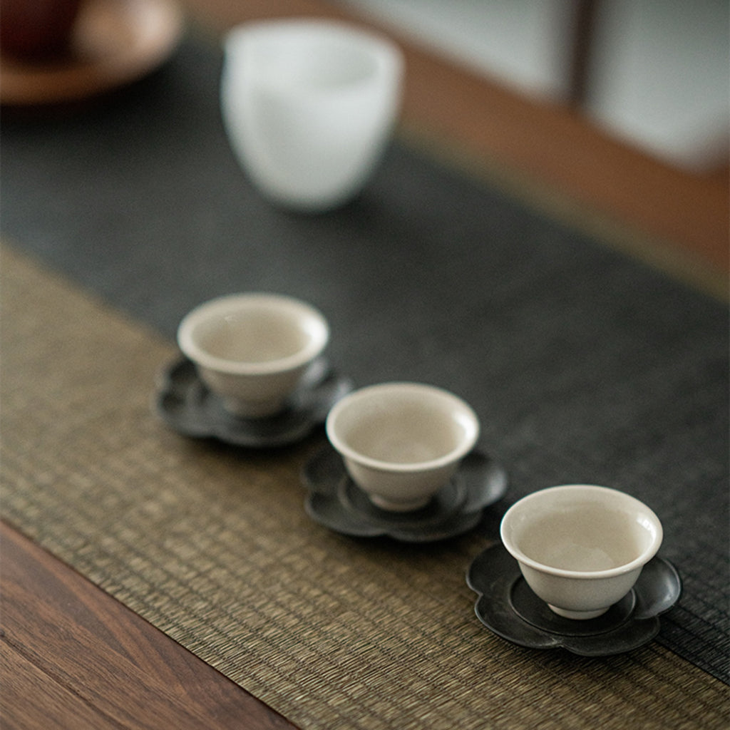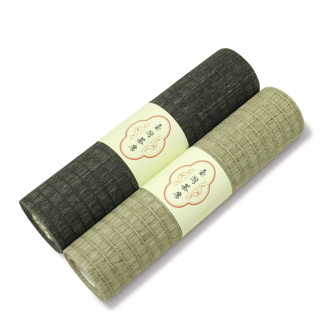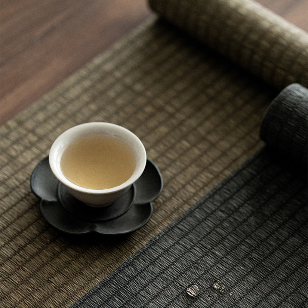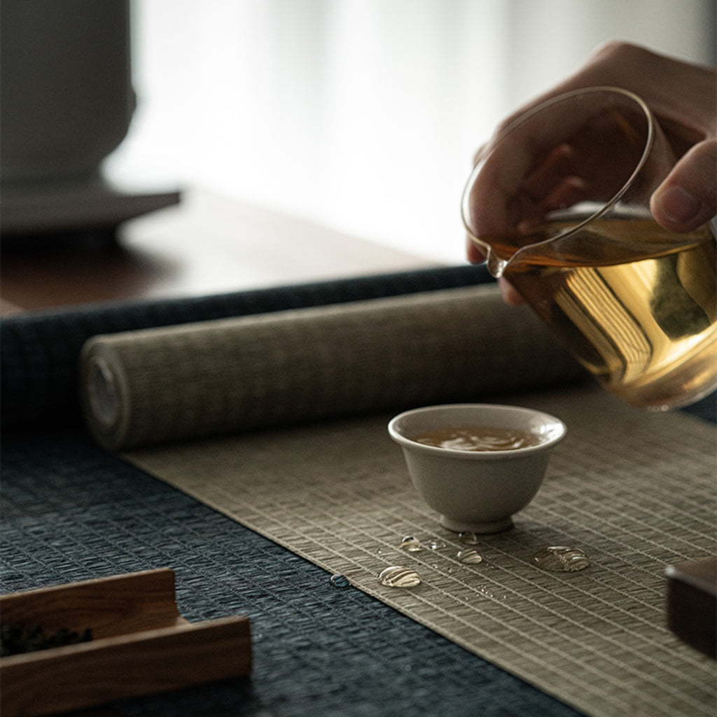 Gongfu cha works extremely well casually—brewing a fresh cuppa' while working or over conversation with a couple of friends—but arranging one's space creates the atmosphere for the attention toward the preparation and appreciation of the tea. These long mats serve as a thin table runner, establishing an aesthetic backdrop for accoutrements and protecting the surface beneath. The fibers are tightly bound and interwoven, yet can easily be rolled up for storage. Trimmed to two different widths with clean edges, each dyed in one of two muted colors, the material adds a touch of the rustic to the elegant appearance, and can easily be combined for more complex arrangements or to match the occasion or teaware used.