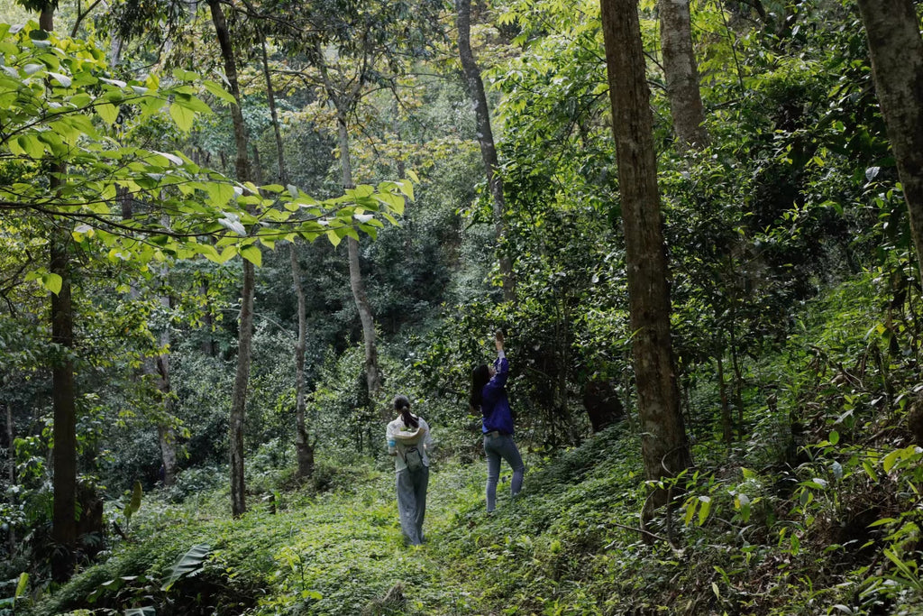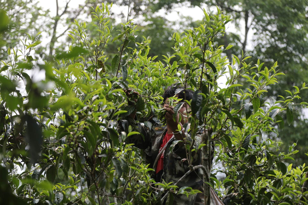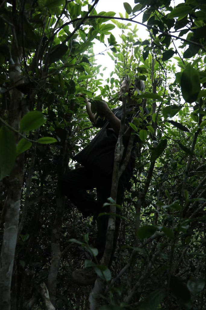 In Spring 2024 and again in Spring 2025, we personally visited Mrs. Lü Qiongying’s garden. The journey from Yiwu town to Guafengzhai is now smoother due to the newly paved road, but reaching the garden still requires navigating a muddy path beyond Guafengzhai village. The tea trees, initially planted by Lü Qiongying’s grandparents about 80 years ago, have been augmented with new plants by successive generations. Accompanying the photos of the Bing Cha, you’ll find images depicting the muddy road leading to the garden, Mrs. Lü Qiongying gazing up at her trees, two pickers harvesting while standing on branches, and a panoramic view showcasing tea trees amid the forest vegetation.