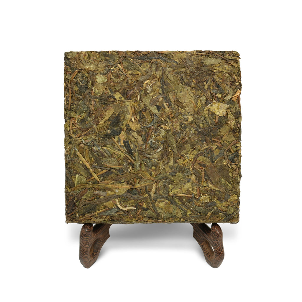 The less-refined plucking from the tea plant finds its own superior classification with this sheng pu'er. Loosely pressed into these unusually square cakes are huang pian or 'yellow pieces' from the spring 2019 harvest in Bingdao, where tea gardens dot the slopes around Mengku River at altitudes of around 2000 m. It is from this environment that one can expect a multifaceted flavor profile in the cup, and this one is a diamond in the rough. After an initial rinse, fresh fragrances of orange peel emerge from the golden brew with a liquor that carries itself like molten honey, though the sweetness is more custard-like. It then slips into dry wood, spice, and leather, giving just enough astringency to complement its minerality. A sheng that the deeply-steeped acolyte will appreciate—in a lasting message, the slightly cooling hui gan brings in the sensations of springtime.