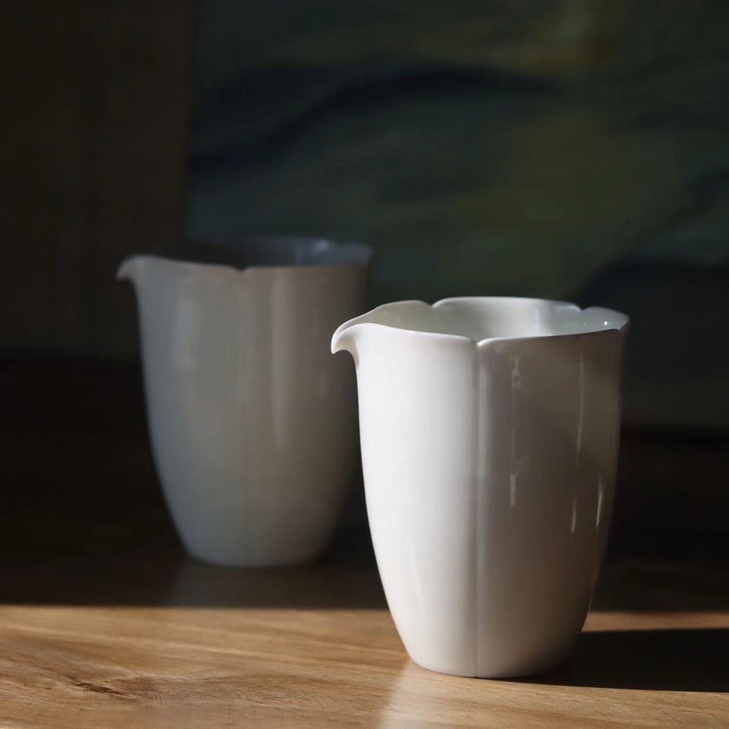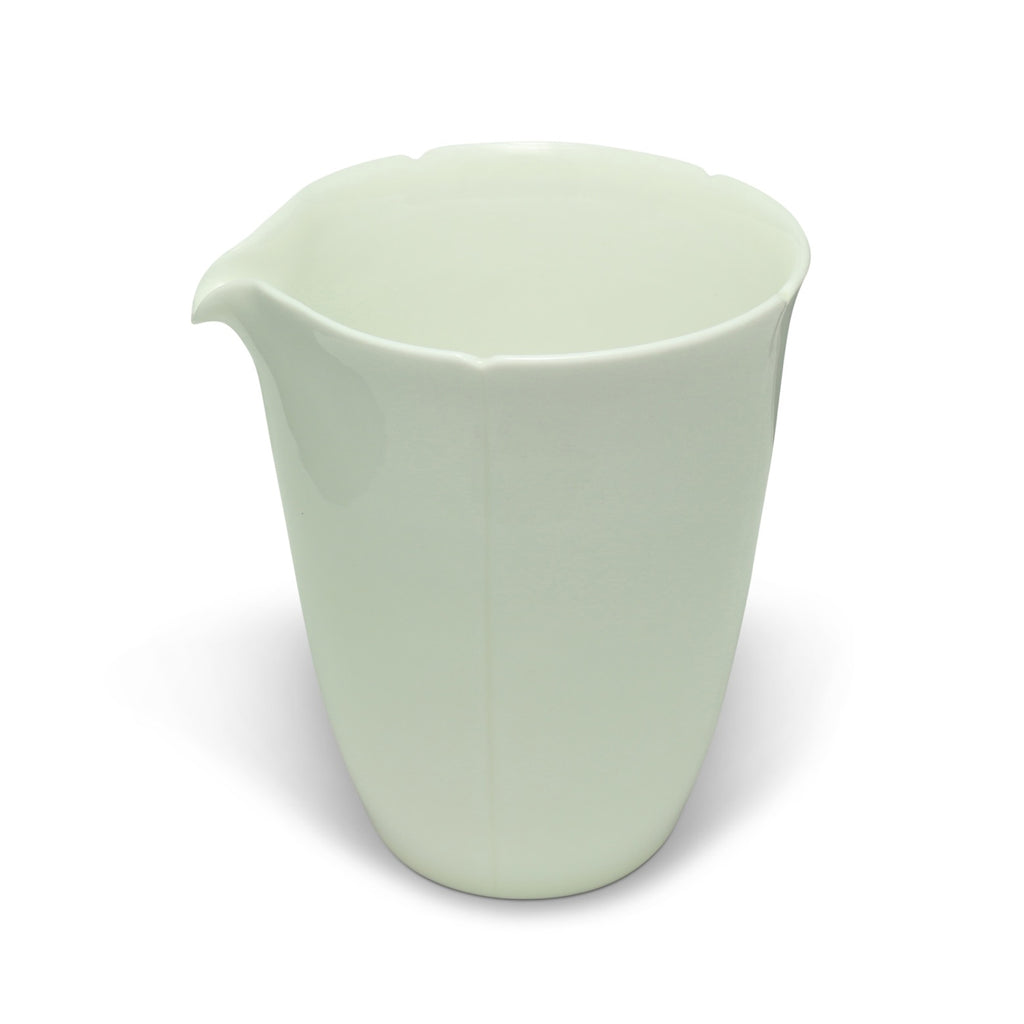 This elongated pitcher with a silky-smooth, just off-white glaze feels extremely comfortable in the hand. A careful, tapering shaping has kept the base thicker and more insulating while the thin rim appears more refined and offers good pour control. With merely four thin lines up the side terminating in hand-cut notches, the artist has transported a classical motif into a simplified vernacular—the mouth meant to evoke an opening sunflower—to allow pairing with both ornate and minimal teaware.