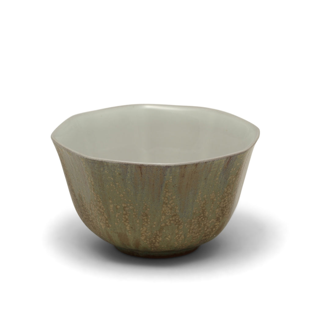 The stony gray glaze is mottled with pinpricks of chalky brown, splashes of lichen-like teal, and tinges of rust, pairing well with natural materials and belying its minimal weight.