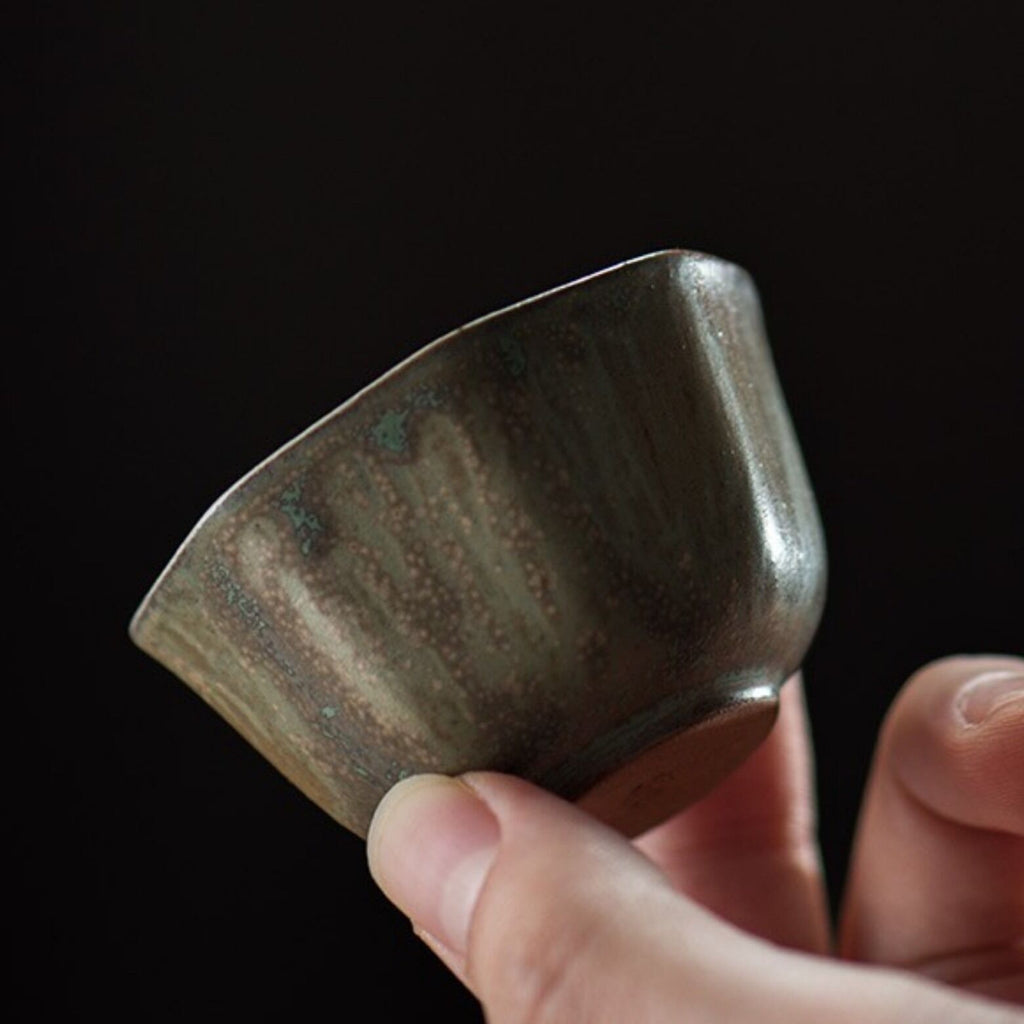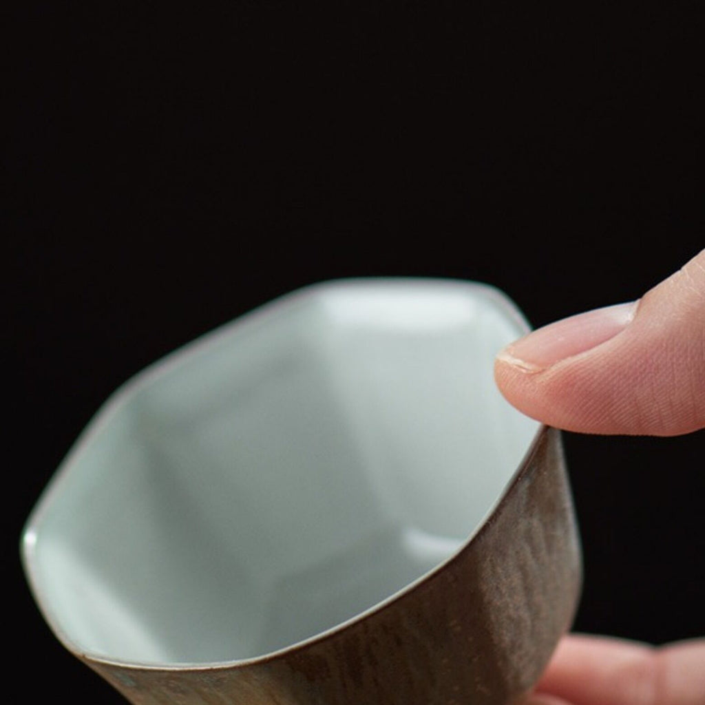 These glazed octagonal cups have the distinction of being selected by our Discord community while we were sourcing teaware in China. The 'eggshell' style is unusual for non-porcelain ceramic, as one can see from ruddy brown material exposed on the foot, and the thin walls tapering to a mere couple millimeters is not only impressive, but keeps the cups airy light in the hand. The soft octagon with its slightly textured exterior glaze adds to the haptics, while the cool off-white interior glaze shows off the color of the infusion beautifully, making these the perfect everyday gongfu cups for those who prefer color and texture to pure white ceramic.