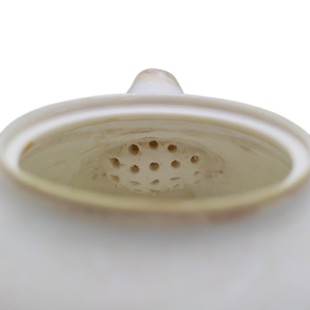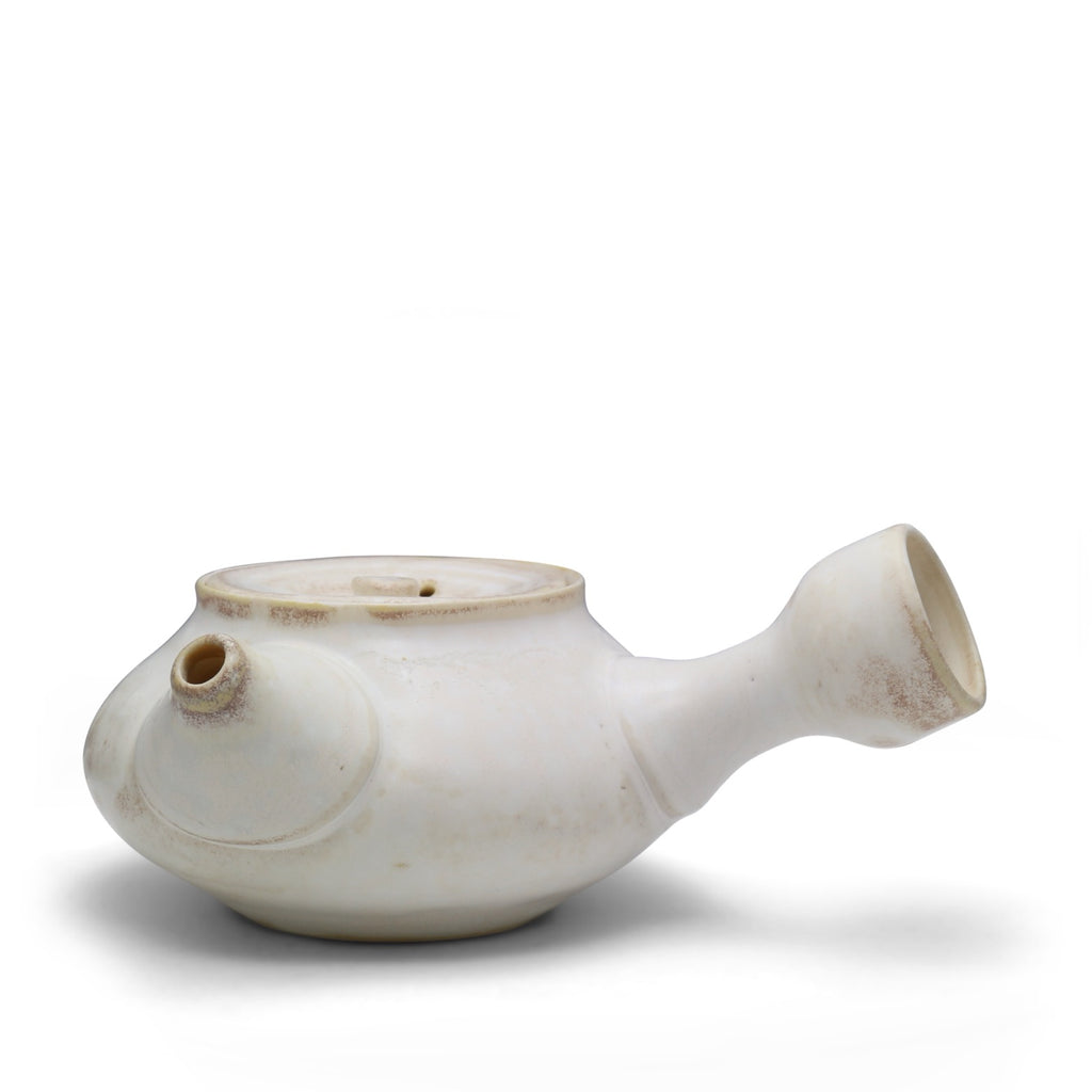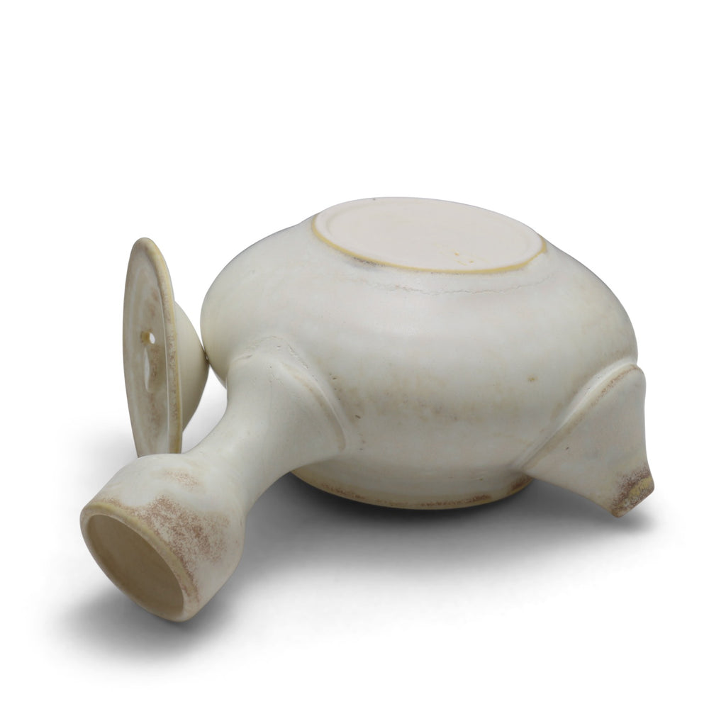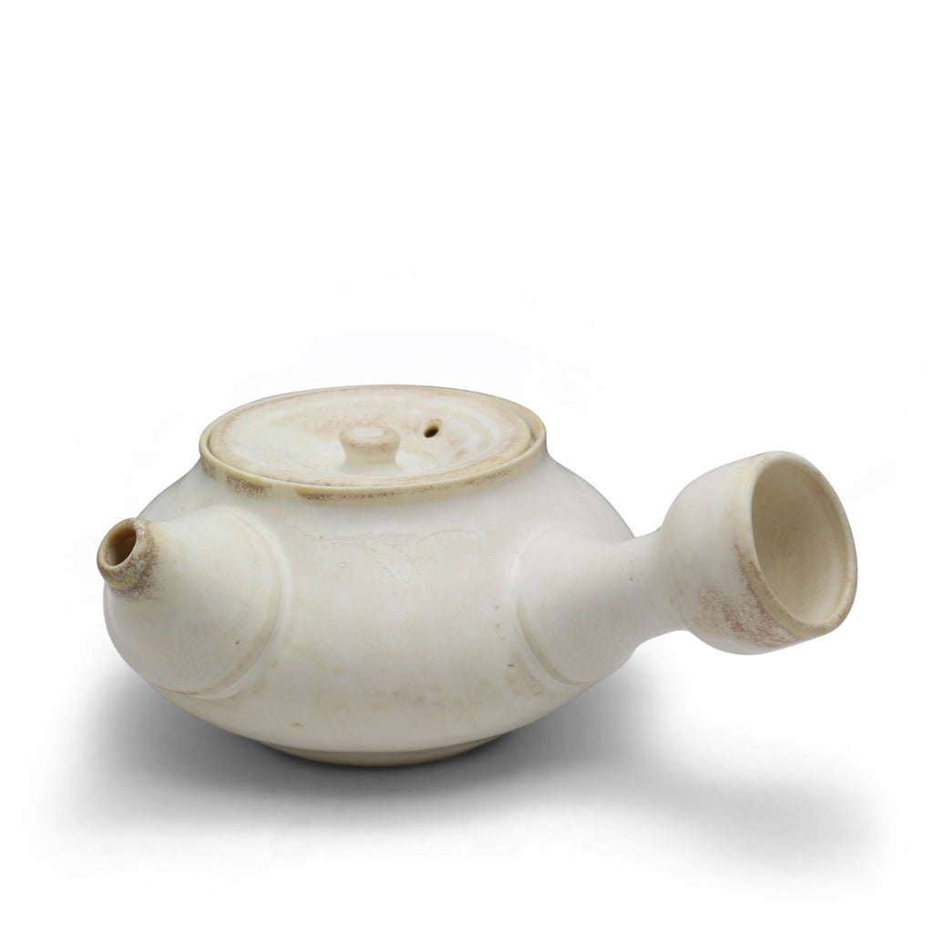 Crafted from creamy stoneware, this teapot wears a milky ivory glaze that softly pools around its bulbous body. The funnel-like spout and thick side-handle invite a steady, balanced pour, while the built-in strainer ensures a crystal-clear cup with every steep.